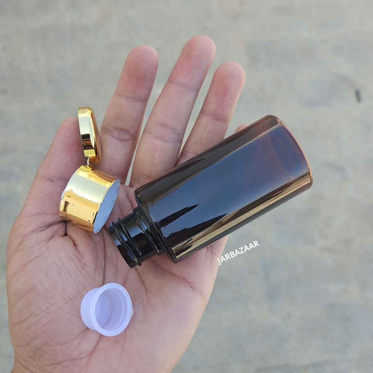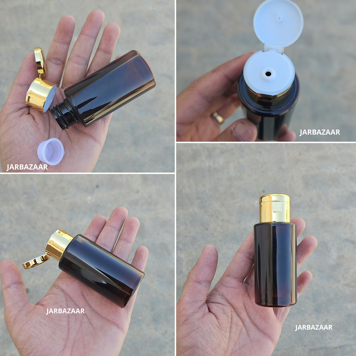 Upgrade your product packaging with our amber flip-top bottle with golden flip top cap – a premium choice for cosmetics, essential oils, serums, lotions, and herbal formulations. The amber PET bottle offers excellent UV protection, preserving the integrity of light-sensitive ingredients, while the sleek golden flip-top cap ensures controlled dispensing and a luxurious finish.