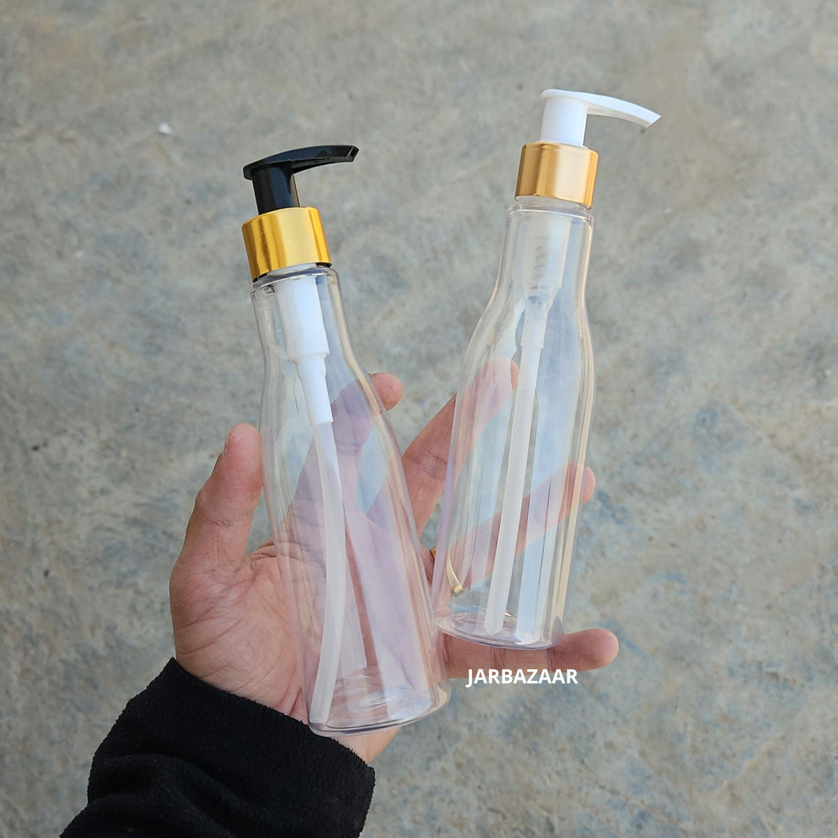 Elevate your personal care routine with these elegant bottles. Featuring a luxurious gold-trimmed collar and your choice of black or white pump dispenser, these bottles bring sophistication to any vanity or bathroom counter. The transparent plastic construction allows you to monitor product levels easily, while the sturdy pump mechanism ensures precise dispensing every time. Perfect for storing lotions, serums, liquid soaps, or other cosmetic formulations, these bottles combine practicality with style. The ergonomic design fits comfortably in hand, making daily use a pleasure. These versatile containers are suitable for a variety of personal care products, making them an excellent choice for both professional and personal use.