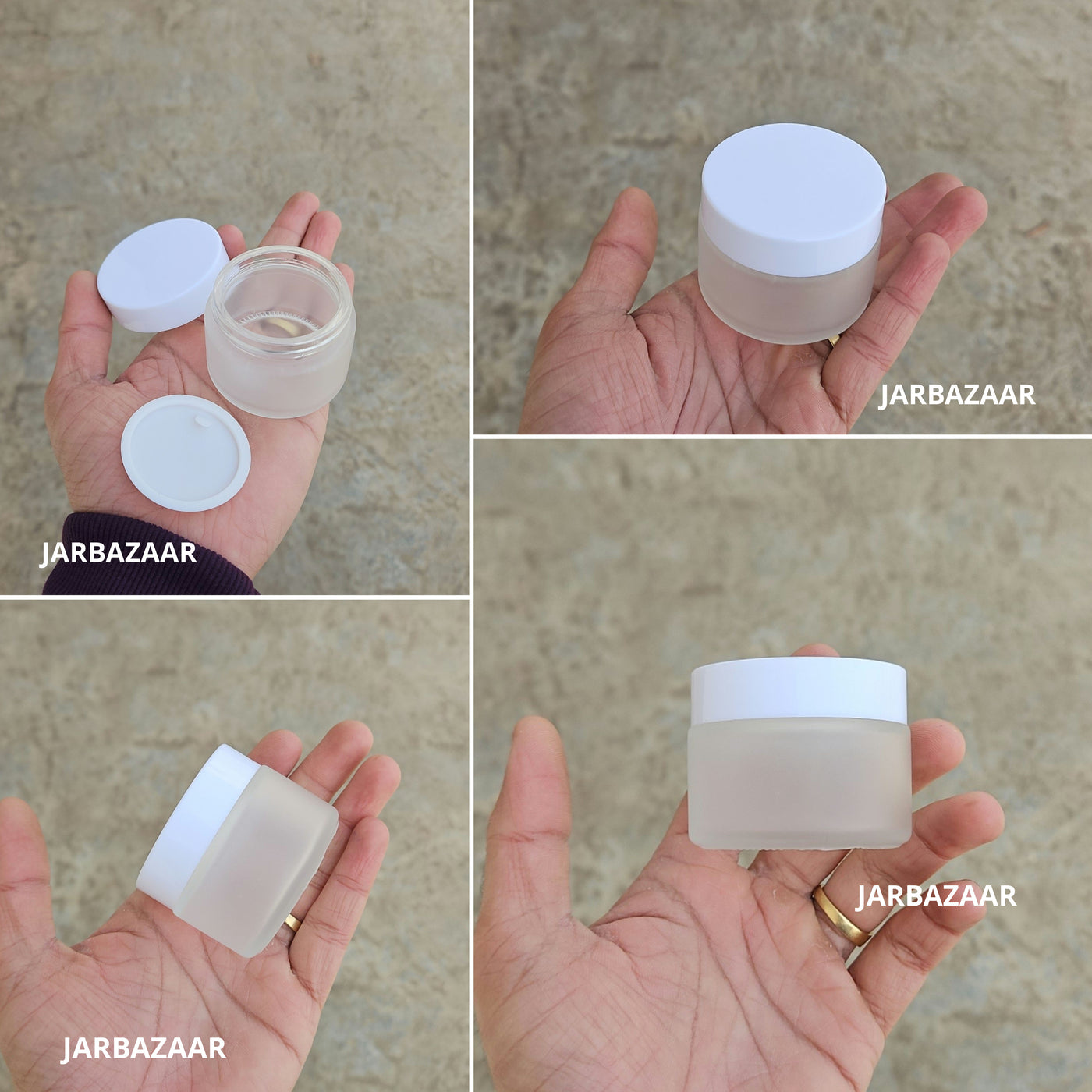 This 50 gram clear frosted glass jar is a premium packaging solution designed for luxury cosmetic, skincare, personal care, and ayurvedic products. Made from high-quality thick frosted glass, the jar features a soft matte finish that enhances shelf appeal while subtly showcasing the product inside.