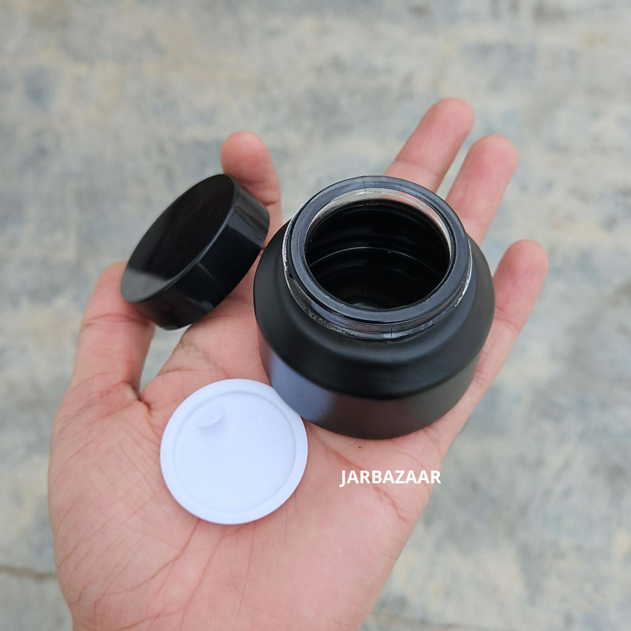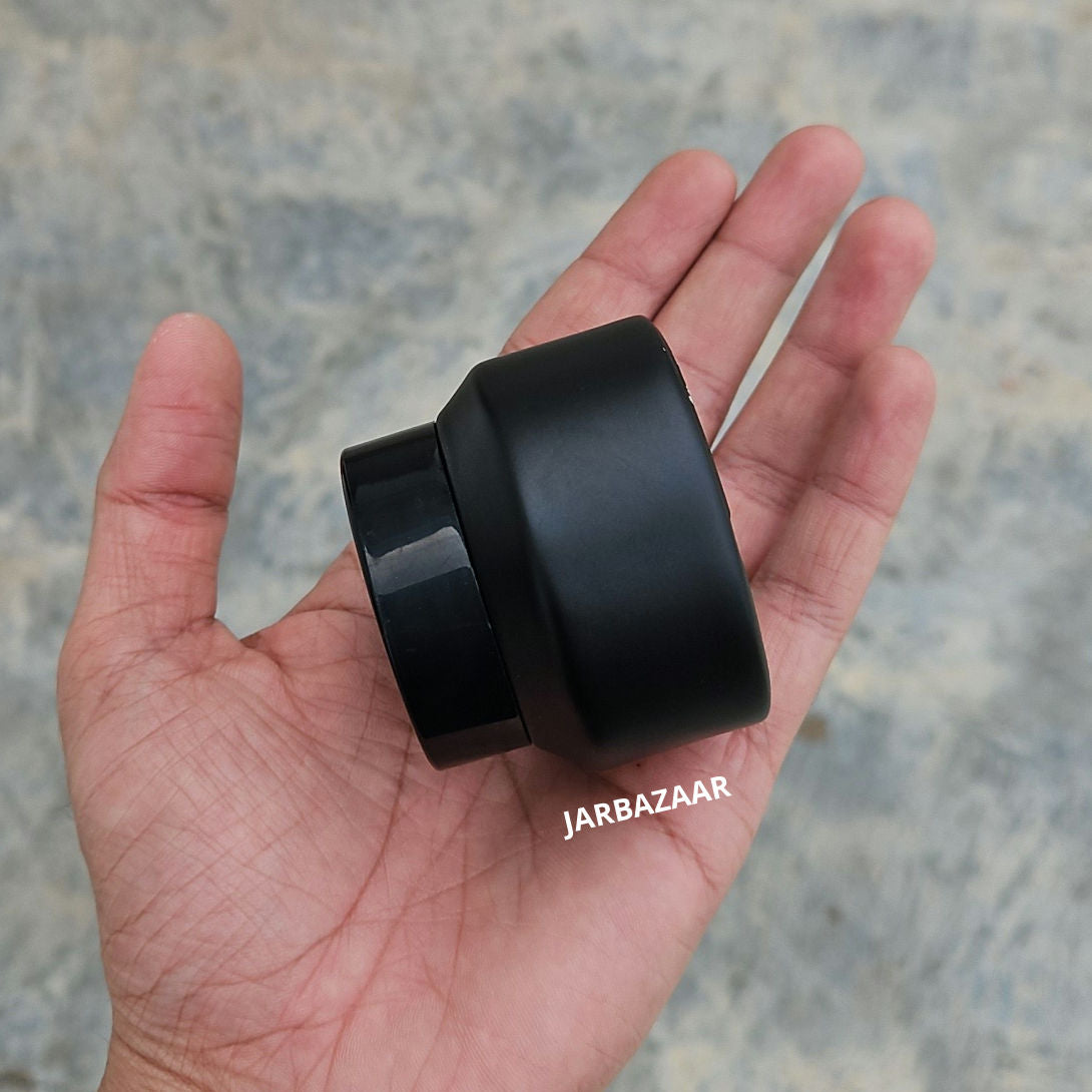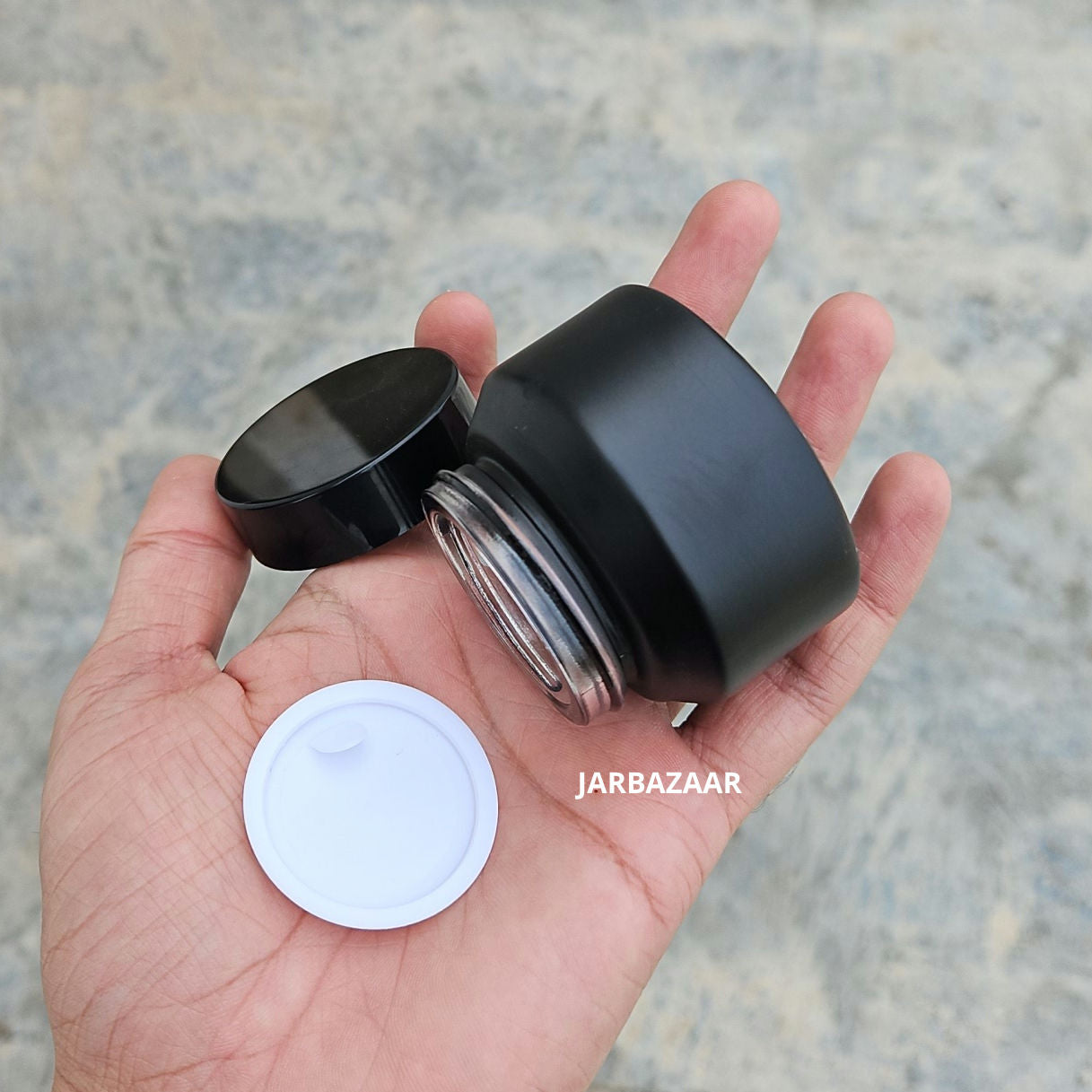 The jar is equipped with a matching black cap and a white inner lid that creates a secure seal to keep products fresh and protected. Its compact size makes it perfect for creams, balms, salves, gels, serums, ointments, lip balms, beard balms, eye creams, and sample products.